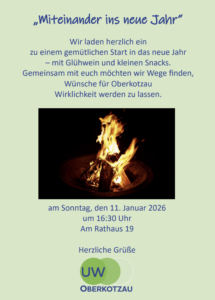 - Miteinander ins neue Jahr 202611. Januar 2026 – Miteinander ins neue Jahr Wir laden herzlich ein zu einem gemütlichen Start in das neue Jahr– mit Glühwein und kleinen Snacks. Gemeinsam mit euch möchten wir Wege finden,Wünsche für Oberkotzau Wirklichkeit werden zu lassen. am Sonntag, den 11. Januar 2026um 16:30 UhrAm Rathaus 19 Herzliche Grüße Eure UW Oberkotzau