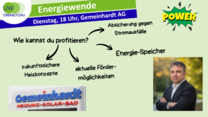 - 3. Februar – Energiewende – wie kannst du profitierenEinladung zur Infoveranstaltung „Energiewende“ – 03.02.2026 Wie kannst du von der Energiewende ganz konkret profitieren – zu Hause, im Alltag und im Geldbeutel? Gemeinsam mit der Gemeinhardt AG laden wir dich herzlich zu einem kompakten Infoabend ein. 📅 Termin: Dienstag, 03.02.2026🕕 Uhrzeit: 18:00 Uhr📍 Ort: Gemeinhardt AG Freu dich auf praxisnahe Einblicke und Antworten auf […]